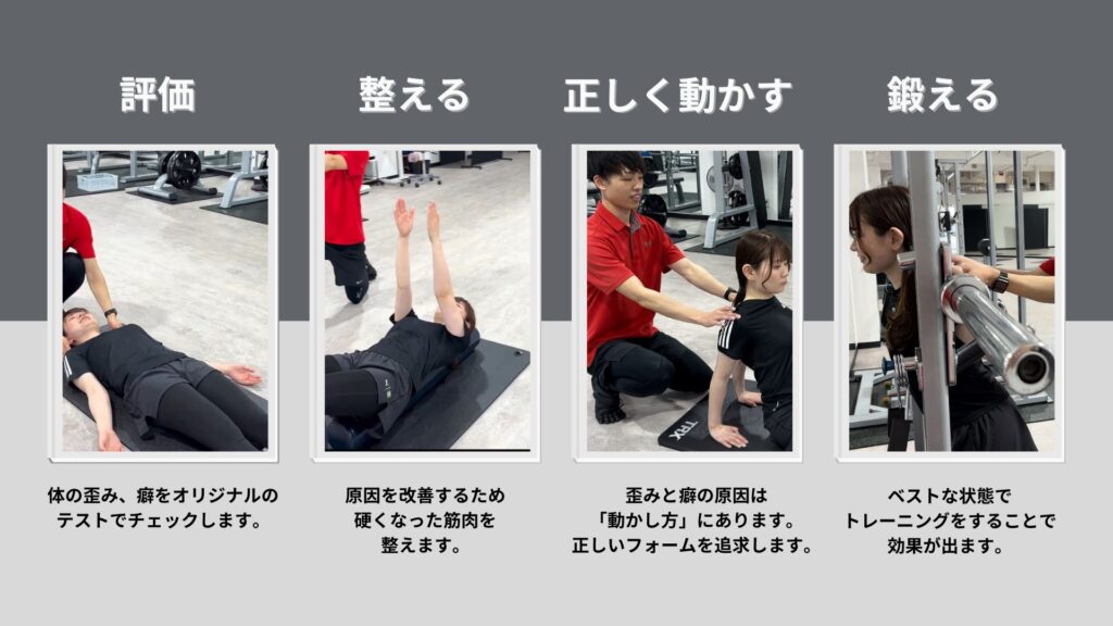 トレーニング前にお悩みに合わせた体のチェックをします。なぜこのトレーニングが必要なのかをきちんとご説明させていただきます。