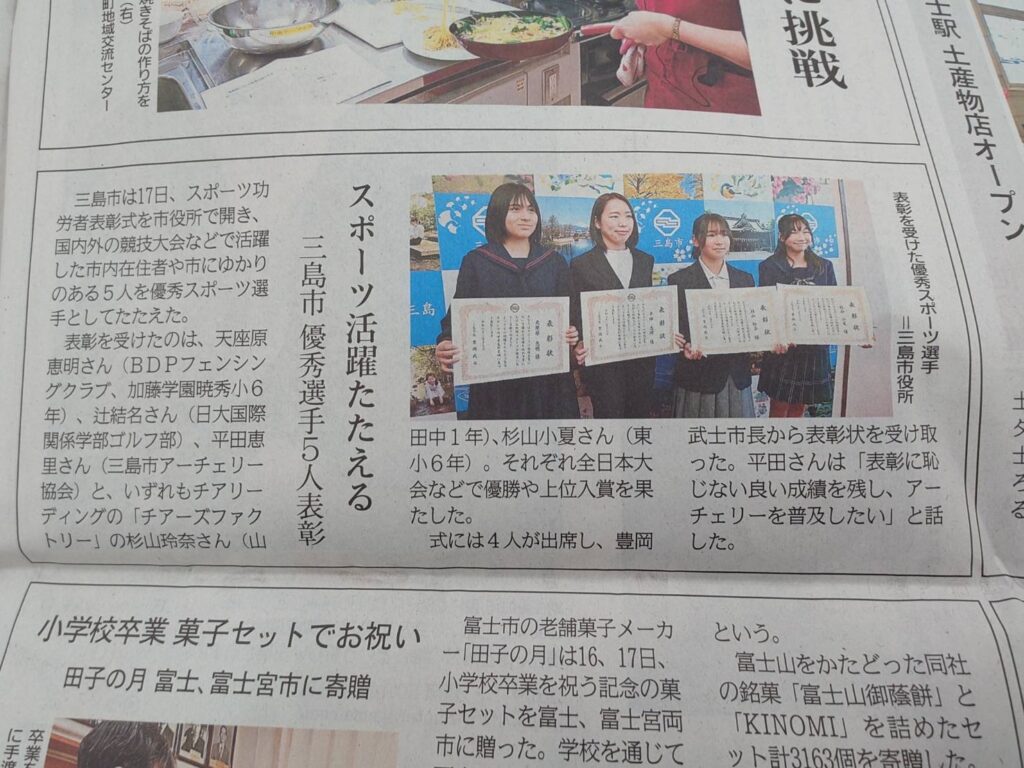 三島市の優秀選手5名のうちの1人に選ばれました!