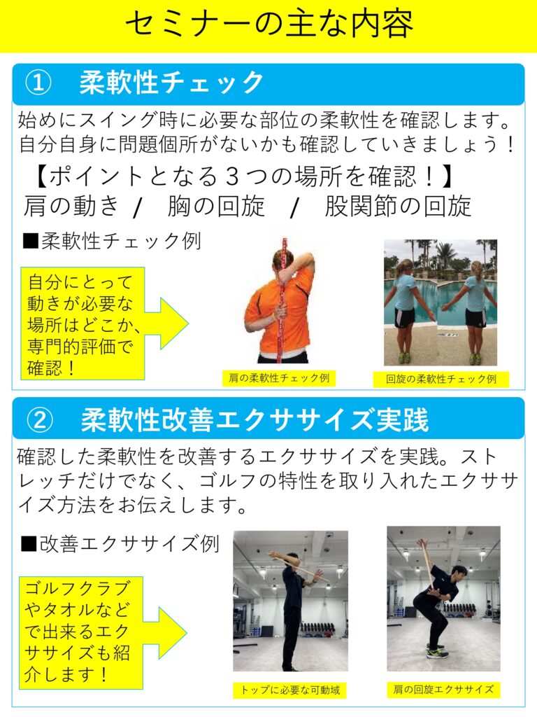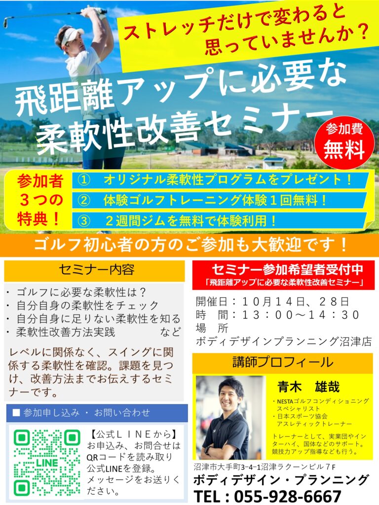 10月14日、28日の土曜日にゴルフにとっても大切な柔軟性についての勉強会を行います。