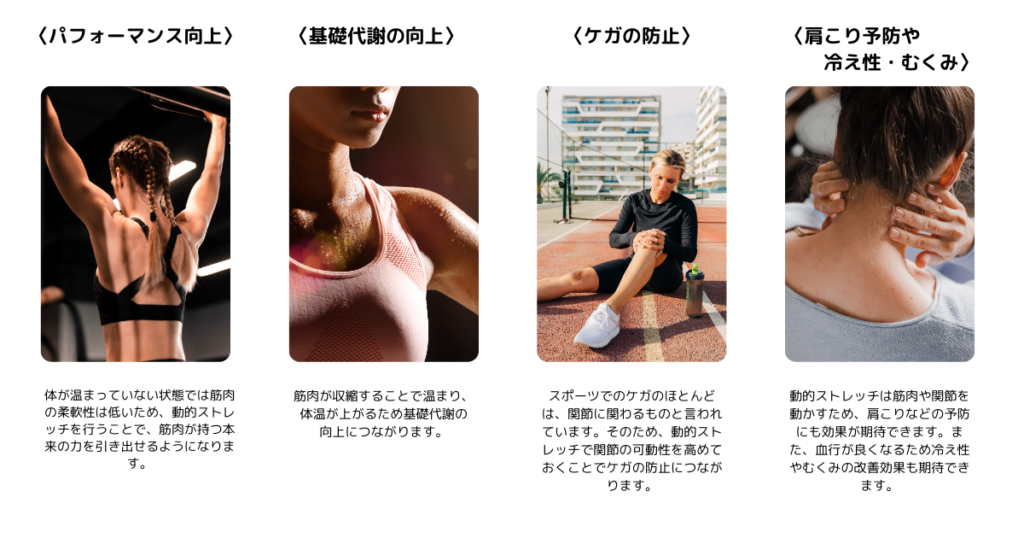 動的ストレッチは、体を大きく動かし筋肉の伸縮を繰り返すことによって、筋肉の柔軟性と関節の可動性を高めます。ダイナミックストレッチとバリスティックストレッチに大別され、スポーツのパフォーマンス向上や体温の上昇のほか、交感神経を優位にする効果があります