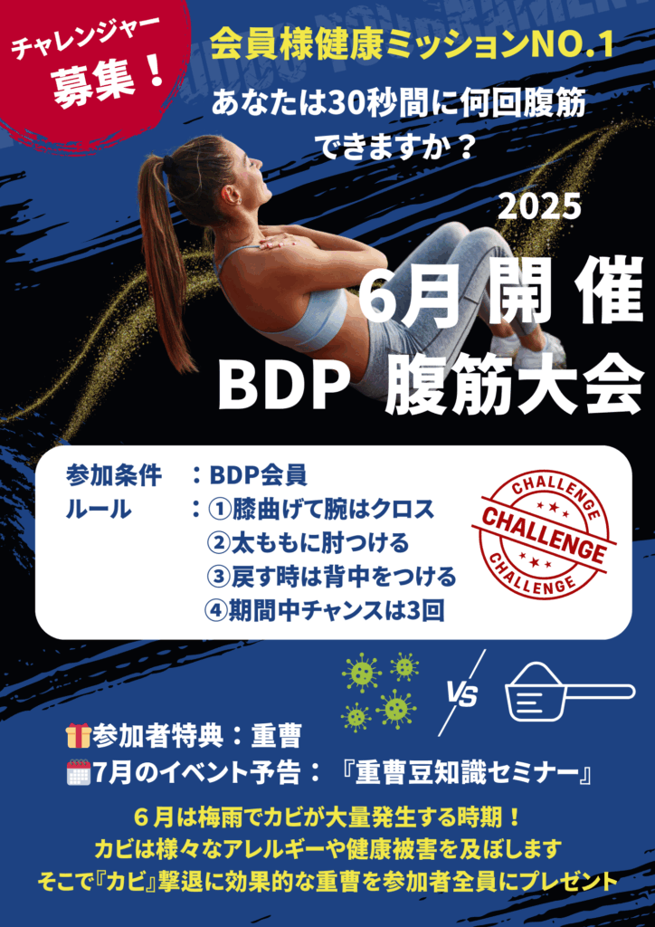 6月は腹筋大会に向けて平日の朝と昼の15分間「腹筋」をテーマにしたショートレッスンを開催いたします。